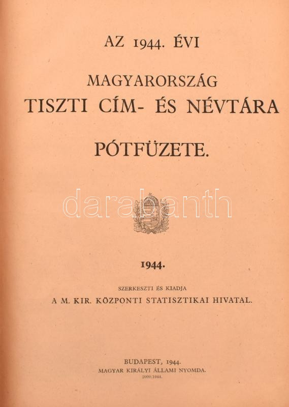 1944 Magyarország tiszti cím- és névtára. 51. évf. 1944. Szerk.: a M. Kir. Központi Statisztikai Hivatal. Bp., 1944, M. Kir. Állami Nyomda, 96+1062 p. Kiadói kissé kopott félvászon-kötésben.
