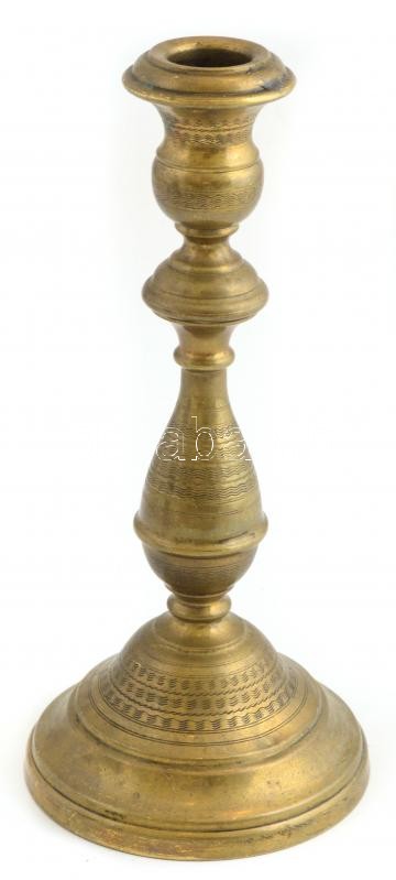 Beschreibung: Réz gyertyatartó, talpán kisebb horpadással, m: 22,5 cm