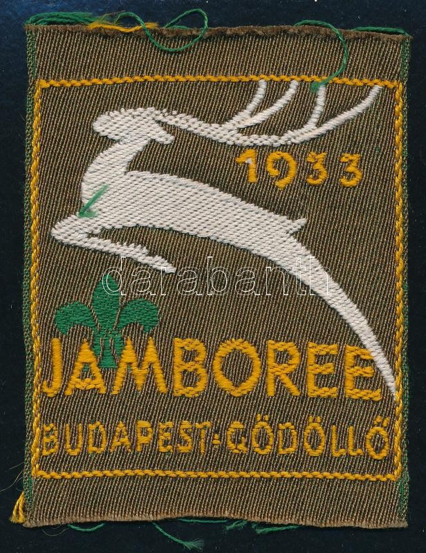 1933 "Jamboree Budapest-Gödöllő" feliratú díszes vászon felvarró, fehér csodaszarvassal, zöld liliommal, 7×5,5 cm / 1933 Richly ornated scout hemstitching with "Jamboree Budapest - Gödöllő" inscription on it, with white Wonderdeer and green fleur-de-lys, 7×5,5 cm