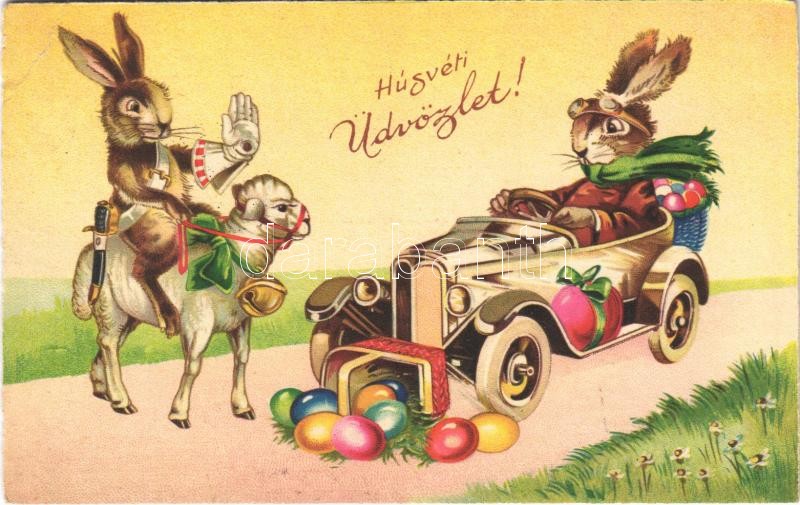 1938 Húsvéti üdvözlet / Easter greeting card with rabbits, automobile,... https://www.darabanth.com/de/386-Fernauktion/386.0/Ansichtskarten/GruC39Fkarten-Feste~1500031/1938-Husveti-udvozlet-Easter-greeting-card-with-rabbits-automobile-eggs-and-sheep-Amag-2571~II2309645