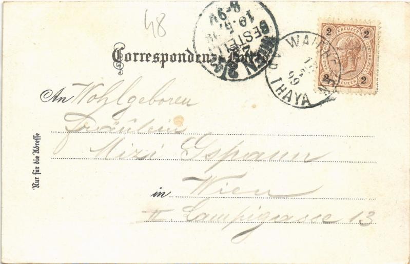 Beschreibung: 1899 Waidhofen an der Thaya, Thayatal, Landes-Real-Gymnasium / general view, grammar school, bridge. Wilh. Schütz Kunstanstalt No. 1534. Art Nouveau, floral, litho