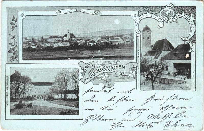 Beschreibung: 1901 Ulrichskirchen-Schleinbach (Ulrichskirchen), general view, church, castle. F. Schöler (Wien) Art Nouveau, floral (worn corners)