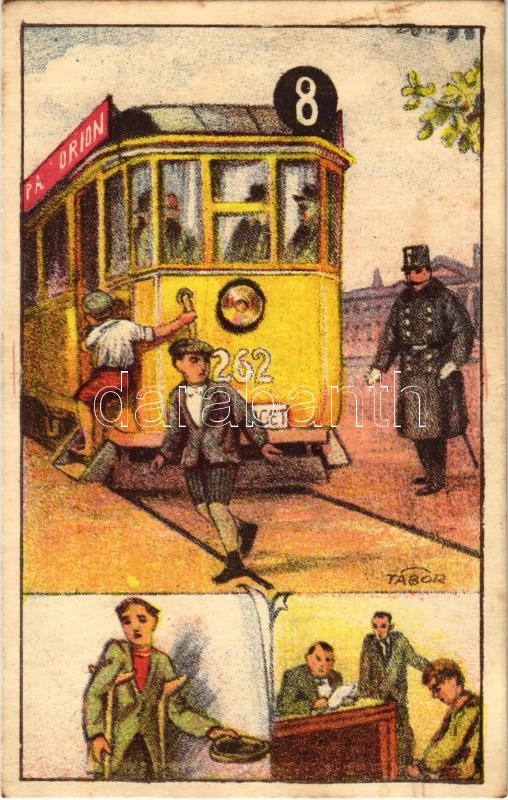 Beschreibung: Rendőri Gyermekbíróság Segélyalap propagandalapja, 8-as villamos / Hungarian charity propaganda card against juvenile delinquency s: Tábor