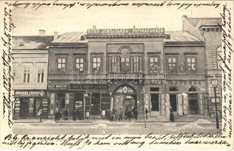 1907 Kolozsvár, Cluj; Deák Ferenc utca, Spácsek ferenc, Hilf Móritz üzlete, Grand Kávéház, Stief Jenő és Társa papíráruháza, saját nyomdája és saját kiadása / street, shops, cafe