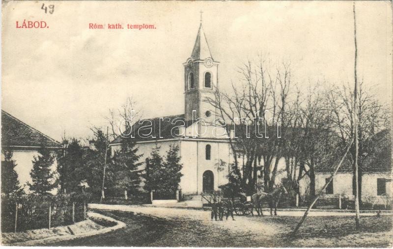 1921 Lábod, Római katolikus templom, lovaskocsi https://www.darabanth.com/de/386-Fernauktion/386.0/Ansichtskarten/Ungarn~1500005/1921-Labod-Romai-katolikus-templom-lovaskocsi~II2310900