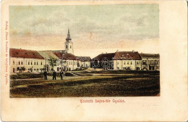 Beschreibung: Gyula, Kossuth Lajos tér, Gyógyszertár, üzletek. Dobay János kiadása (fl)
