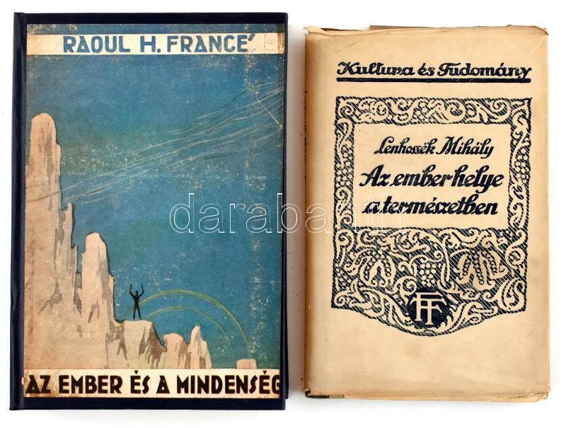 Lenhossék Mihály: Az ember helye a természetben. Kultura és Tudomány. Bp.1921, Franklin. Kiadói félvászon-kötés, kiadói papír védőborítóban. + Raoul H. Francé: Az ember és a mindenség. Ford.: Lambrecht Kálmán. Műveltség. Bp., én., Dante. Átkötött modern műbőr-kötés.