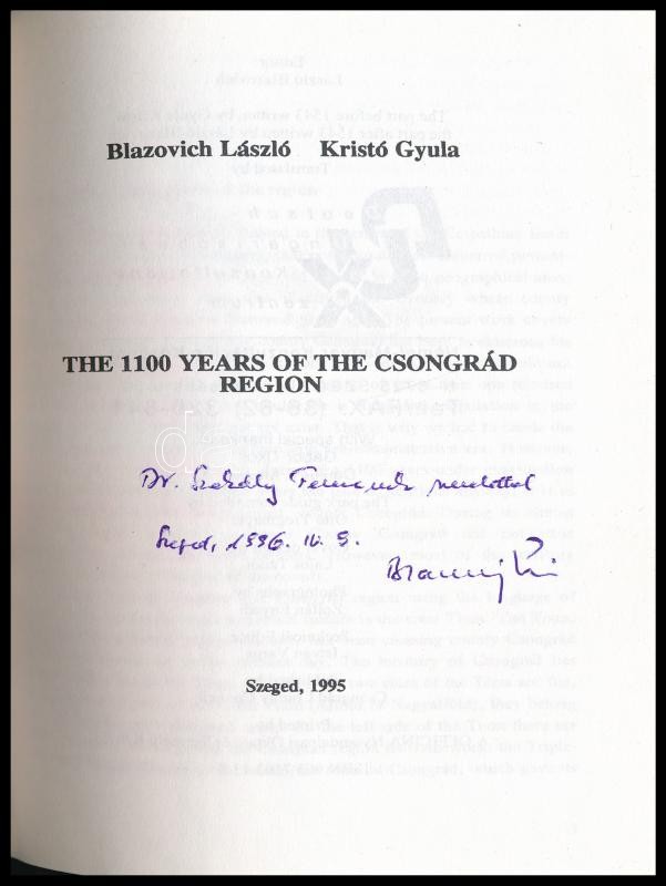 Blazovich László. Kristó Gyula: 1100 years of the Csongrad region. Szeged, 1995, Csongrád County Council. Az egyik szerző, Blazovich László (1943-) által Szakály Ferenc (1942-1999) magyar történész, muzeológus, a Magyar Tudományos Akadémia levelező tagjának dedikált! Kihajtható térkép melléklettel. Fekete-fehér és színes képekkel illusztrálva. Angol nyelven Kiadói papírkötés.