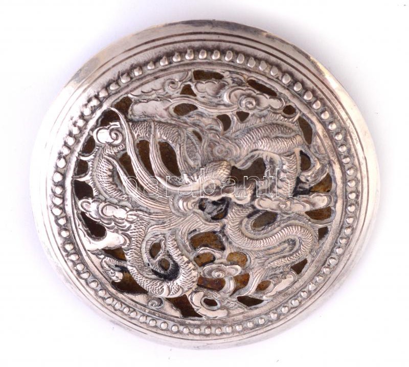 Ezüst (Ag) sárkányos kitűző. Jelzett, áttört. 14,5 g, d: 45 mm https://www.darabanth.com/de/386-Fernauktion/386.0/Juwelen/Juwelen~1000001/Ezust-Ag-sarkanyos-kituzo-Jelzett-attort-14-5-g-d-45-mm~II2311391