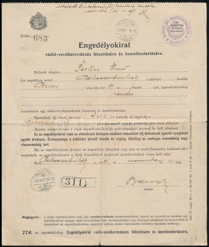 1931 Engedélyokirat rádió-vevőberendezés létesítésére és üzembentartás... https://www.darabanth.com/de/386-Fernauktion/386.0/Kunst-Dokumente-andere-Sammelgebiete/Dokument~500018/1931-Engedelyokirat-radio-vevoberendezes-letesitesere-es-uzembentartasara-plus-2-db-kartot~II2307566
