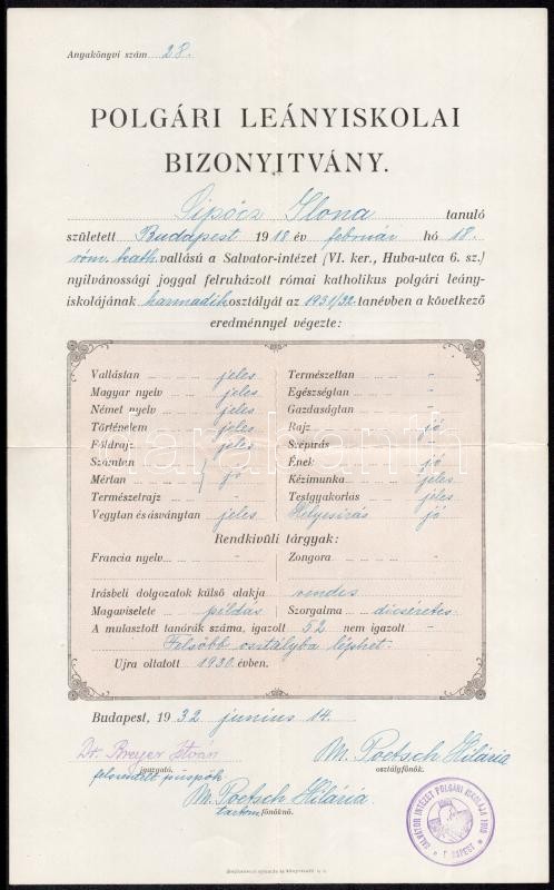 1932 Salvátor-Intézet polgári leányiskolai bizonyÃtvány, Budapest, Hub... https://www.darabanth.com/de/386-Fernauktion/386.0/Kunst-Dokumente-andere-Sammelgebiete/Dokument~500018/1932-Salvator-Intezet-polgari-leanyiskolai-bizonyitvany-Budapest-Huba-u-6-Breyer-Istvan-~II2208404