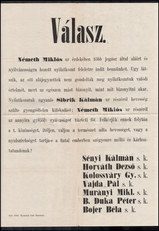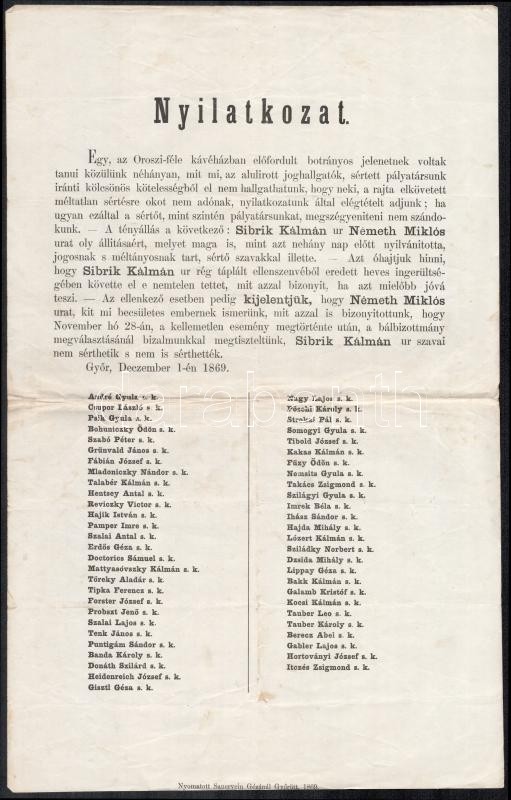 1869 Győr, Sibrik Kálmán és Német Miklós vitája kapcsán Német Miklós mellett tett nyilatkozat, számos névvel, valamint az arra adott válasz, melyben többen kiállnak Sibrik Kálmán mellett, hajtottak, az egyiken kis foltokkal, 39x24 cm, 41x34 cm