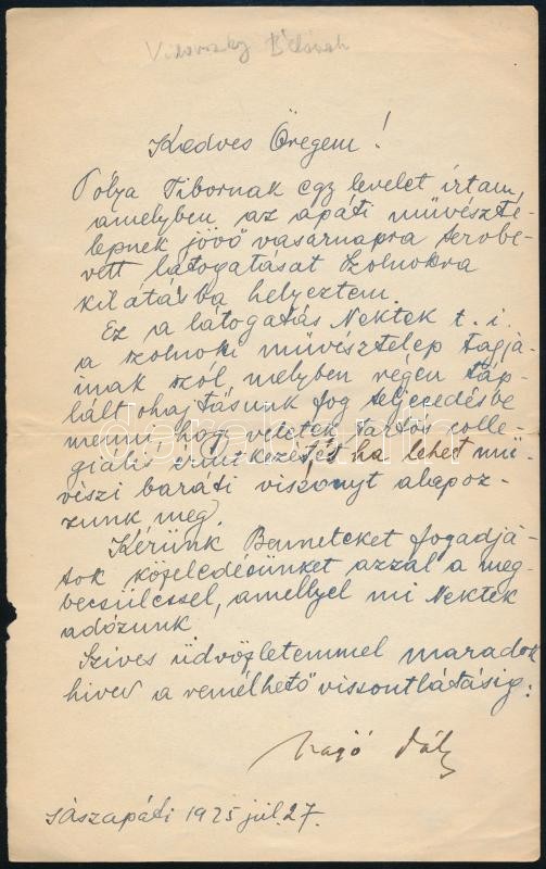 1925 Vágó Pál (1853-1928) festőművész, a Feszty-körkép egyik alkotójának saját kézzel aláírt levele Vidovszky Béla festőművésznek, a jászapáti és a szolnoki művésztelepek baráti viszonyának kialakítása érdekében, jó állapotban