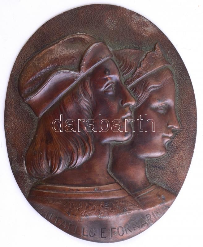 "Raffaello e Fornarina" feliratú fém plakett, 14×11,5 cm https://www.darabanth.com/de/386-Fernauktion/386.0/Kunst-Dokumente-andere-Sammelgebiete/Skulpturen-Statuetten-Plaketten~500009/Raffaello-e-Fornarina-feliratu-fem-plakett-14C39711-5-cm~II2304107