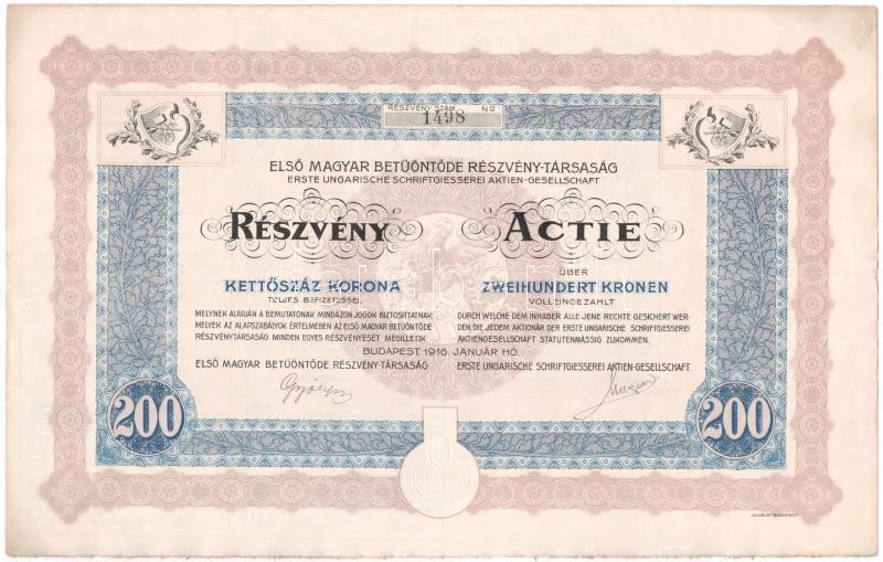 Budapest 1916. "Első Magyar Betűöntöde Részvény-Társaság" ré... https://www.darabanth.com/de/386-Fernauktion/386.0/Numismatik/Aktien-und-Tickets~2000005/Budapest-1916-Elso-Magyar-Betuontode-Reszveny-Tarsasag-reszvenye-200K-rol-szelvenyekk~II2312749