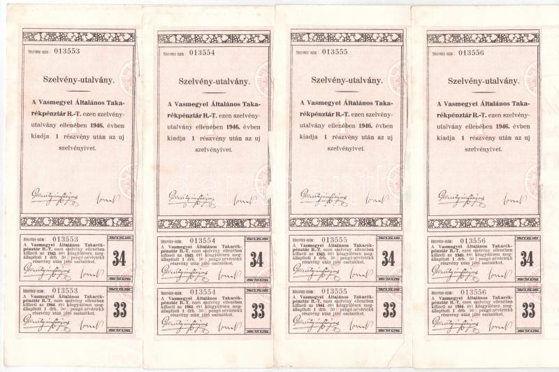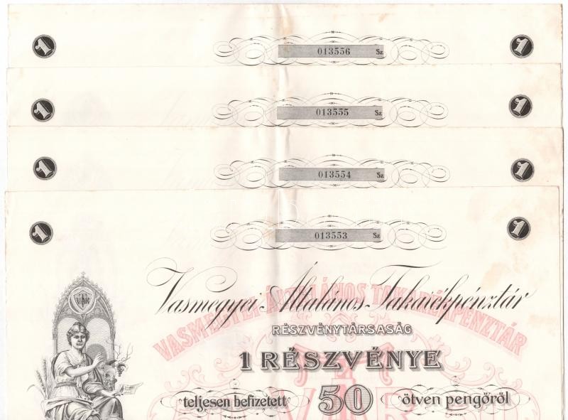 Beschreibung: Szombathely 1926. "Vas Megyei Takarékpénztár" névre szóló részvény 50P-ról (4x) sorszámkövetők, szelvényekkel, szárazpecséttel T:II