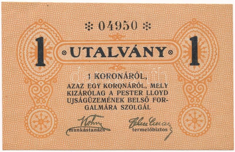 Budapest ~1920. 1K "Pester Lloyd" utalvány hátoldalon bélyeg... https://www.darabanth.com/de/386-Fernauktion/386.0/Numismatik/Notgeld-aus-Papier-und-Metall~2000006/Budapest-7E1920-1K-Pester-Lloyd-utalvany-hatoldalon-belyegezve-TI-Adamo-BUC-2121~II2307381