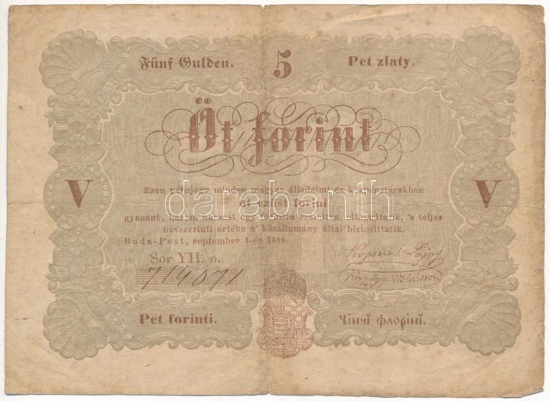 1848. 5Ft "Kossuth bankó" barna nyomat T:III fo.,firka, kis ... https://www.darabanth.com/de/386-Fernauktion/386.0/Numismatik/Ungarische-Banknoten~2000007/1848-5Ft-Kossuth-banko-barna-nyomat-TIII-fo-firka-kis-szakadas-Adamo-G109A~II2314303