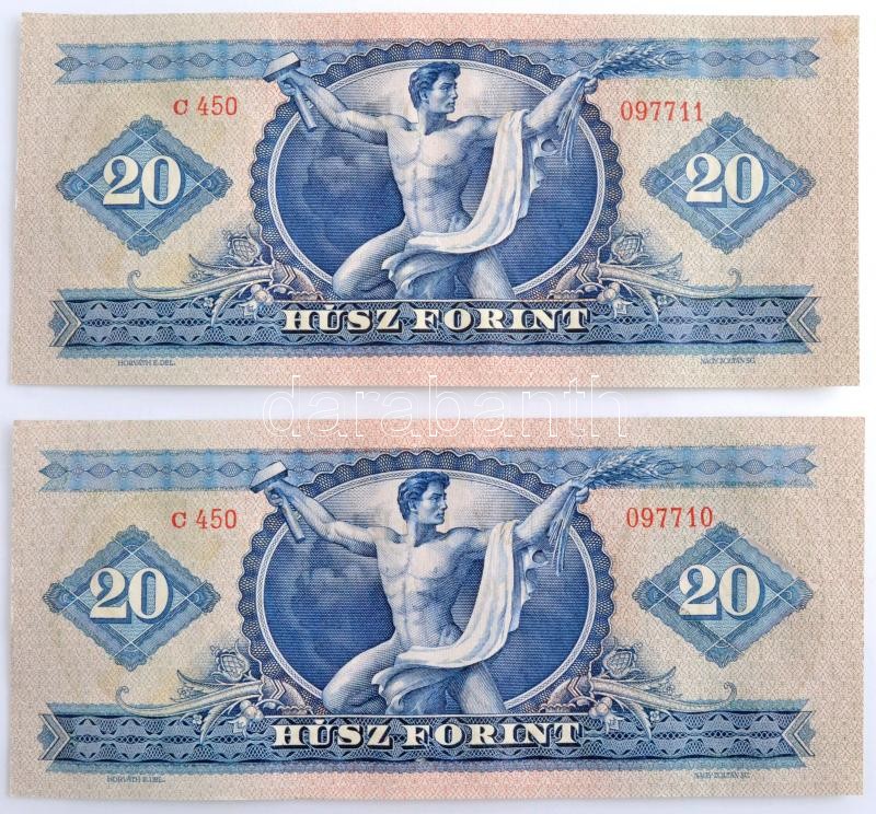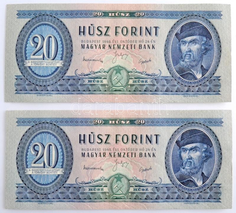 1949. 20Ft (2x) sorszámkövetők "C 450 097710", "C 450 0... https://www.darabanth.com/de/386-Fernauktion/386.0/Numismatik/Ungarische-Banknoten~2000007/1949-20Ft-2x-sorszamkovetok-C-450-097710-C-450-097711-nyomdai-papirrancokkal-TI-I-~II2314570