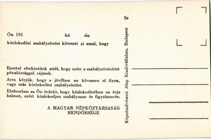 Ön Közlekedési szabálysértést követett el. A Magyar Népköztársaság Rendőrsége figyelmeztető képeslapja. Képzőművészeti Alap Kiadóvállalat / Hungarian People's Republic Police's cautionary postcard for traffic offenders