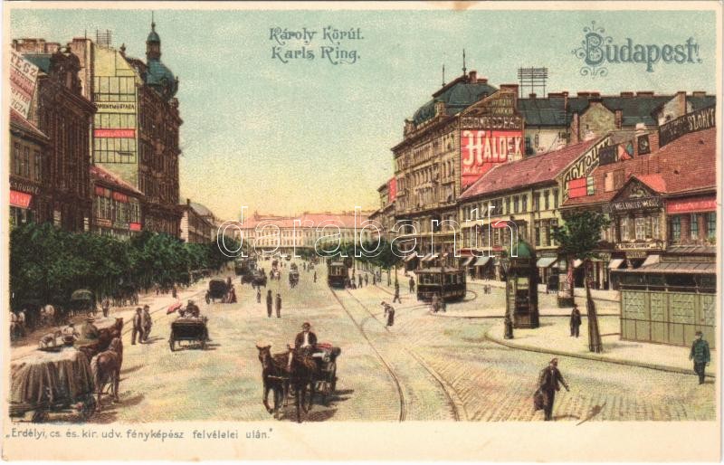 Beschreibung: Budapest V. Károly körút, villamosok, Haldek szőnyegház, Wellinger és Weiss, Strausz üzletei, Erdélyi felvételei után. litho