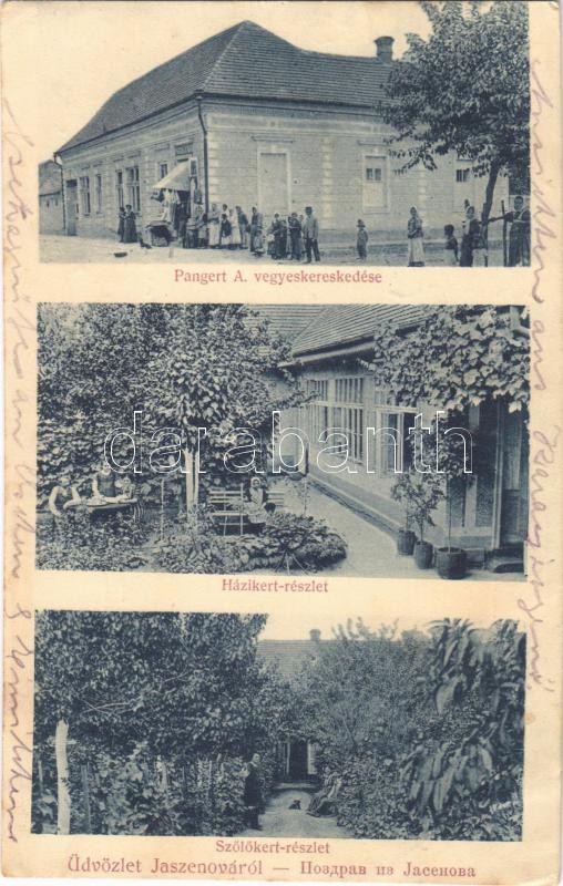 Beschreibung: Karasjeszenő, Jaszenova, Jasenovo; Pangert A. vegyeskerekedése, házikert és szőlőkert, üzlet / shop, garden, vineyard (EB)