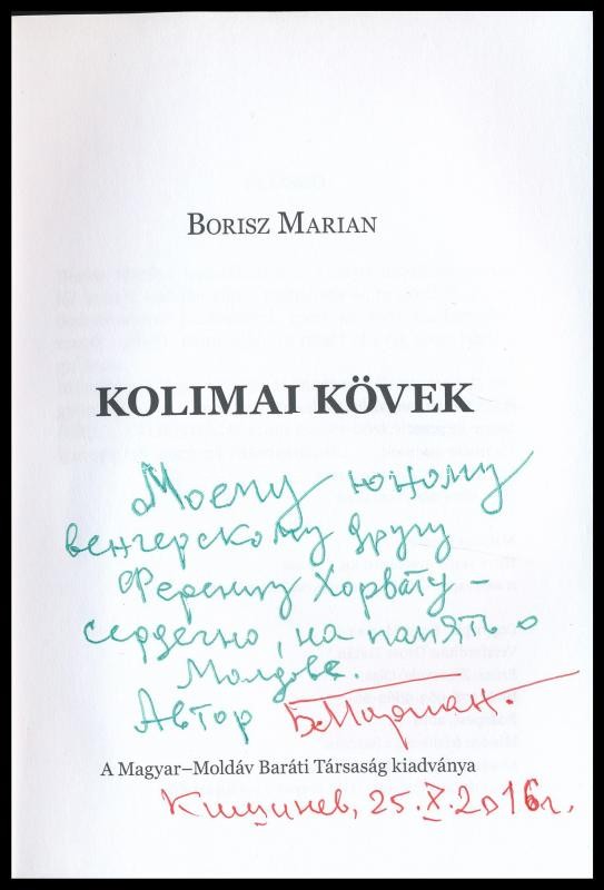 Borisz Marian: Kolimai kövek. Ford.: Orosz Zoltán. Bp., 2014, Magyar-M... https://www.darabanth.com/de/387-Fernauktion/387.0/Bucher/Bucher-Andere-kuriositaten~1000018/Borisz-Marian-Kolimai-kovek-Ford-Orosz-Zoltan-Bp-2014-Magyar-Moldav-Barati-Tarsasag-E~II2318099
