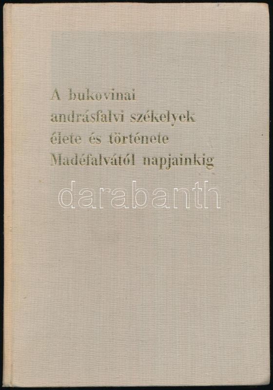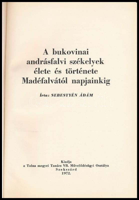 Sebestyén Ádám: A bukovinai andrásfalvi székelyek élete és története Madéfalvától napjainkig. Szekszárd, 1972, Tolna megyei Tanács VB. Művelődésügyi Osztálya. Egészvászon-kötés. Foltos, a gerincen ceruza nyomok.