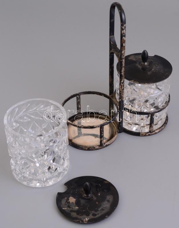 Ezüst (Ag) só-bors tartó, ezüst fedelekkel, metszett ólomkristály betéttel, jelzett (Bachruch A Succ), az üvegbetét karcos, 15,5x12,5x6 cm, fedők: d: 6 cm, üveg betétek: 7x6 cm, nettó súlya üvegbetétek nélkül: 208 gr.