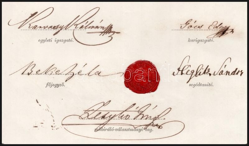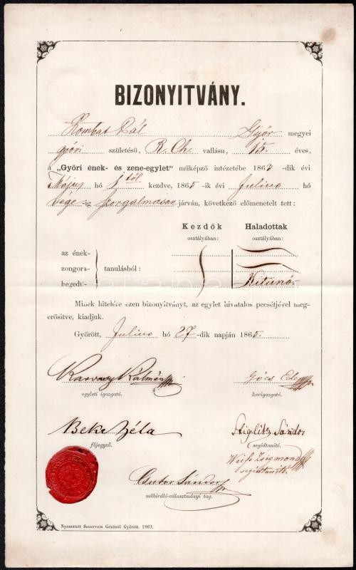 1864-1865 Győri Ének - és Zene-Egylet Műképző Intézetének 2 bizonyítvá... https://www.darabanth.com/de/387-Fernauktion/387.0/Kunst-Dokumente-andere-Sammelgebiete/Dokument~20/1864-1865-Gyori-Enek-es-Zene-Egylet-Mukepzo-Intezetenek-2-bizonyitvanya-viaszpecsetekk~II2320440