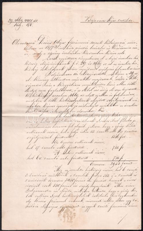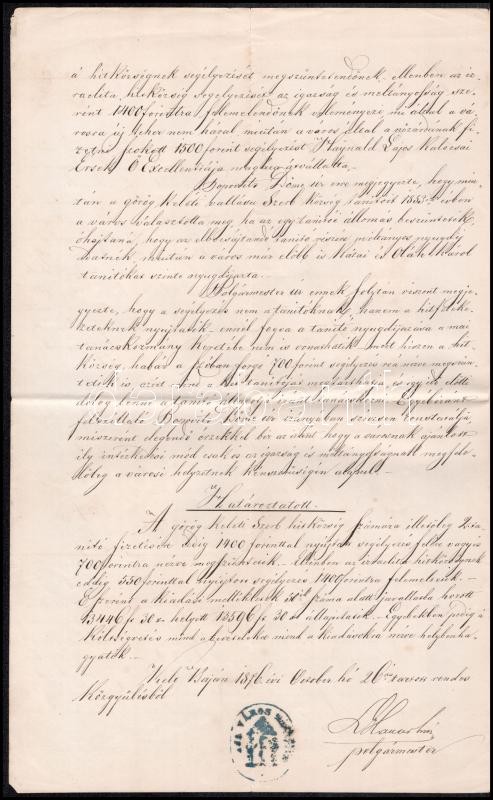 Beschreibung: 1876 Baja, görög keleti szerb hitközség és izraelita hitközség számára nyújtott segély ügyében hozott határozat a polgármester aláírásával