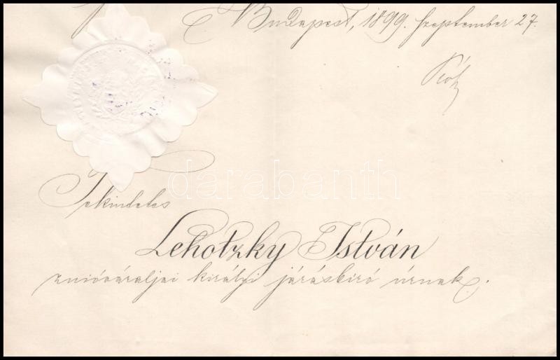1899 Lehotzky István besztercebányai kir. törvényszéki bírói kinevezése, Plósz Sándor (1846-1925) igazságügyi miniszter (Széll-kormány, 1899-1903) aláírásával, fejléces papíron, szárazpecséttel, okmánybélyeggel.