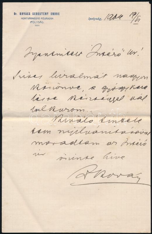 1906 Ipolyság, Dr. Kovács Sebestyén Hont vármegye főorvosának levele f... https://www.darabanth.com/de/387-Fernauktion/387.0/Kunst-Dokumente-andere-Sammelgebiete/Dokument~20/1906-Ipolysag-Dr-Kovacs-Sebestyen-Hont-varmegye-foorvosanak-levele-fejleces-levelpapirja~II2319750