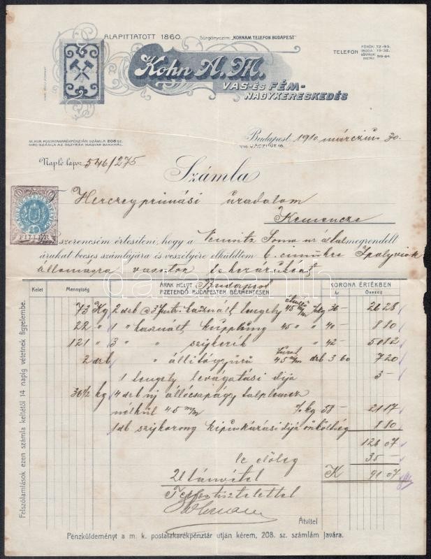 Beschreibung: 1910 Bp., Kohn A. M. Vas- és Fém-Nagykereskedésének fejléces számlája a Hercegprímási Uradalom (Kemence) számára