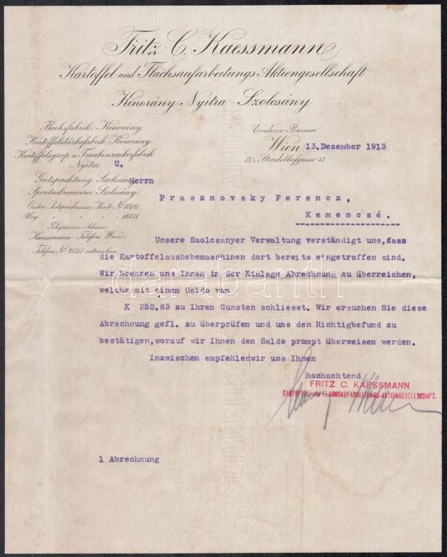 Beschreibung: 1913 Bécs, Fritz C. Kaesmann Kartoffel- und Flachsaufarbeitungs-Aktiengesellschaft Kinorány-Nyitra-Szolcsány fejléces levélpapírjára írt levél