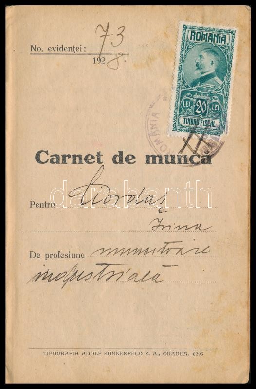 1928 Nagyvárad, román munkavállalási engedély https://www.darabanth.com/de/387-Fernauktion/387.0/Kunst-Dokumente-andere-Sammelgebiete/Dokument~20/1928-Nagyvarad-roman-munkavallalasi-engedely~II2319360