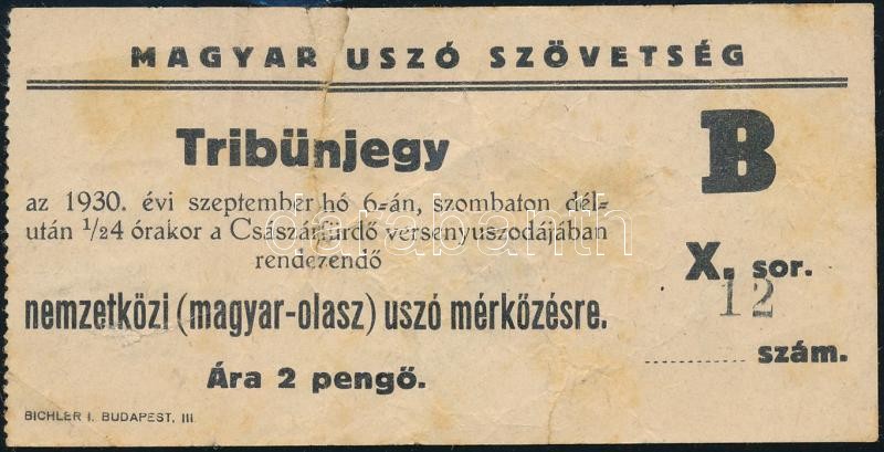 1930 Magyar Úszó Szövetség tribünjegy magyar-olasz mérkőzésre, tépett https://www.darabanth.com/de/387-Fernauktion/387.0/Kunst-Dokumente-andere-Sammelgebiete/Dokument~20/1930-Magyar-Uszo-Szovetseg-tribunjegy-magyar-olasz-merkozesre-tepett~II2319105
