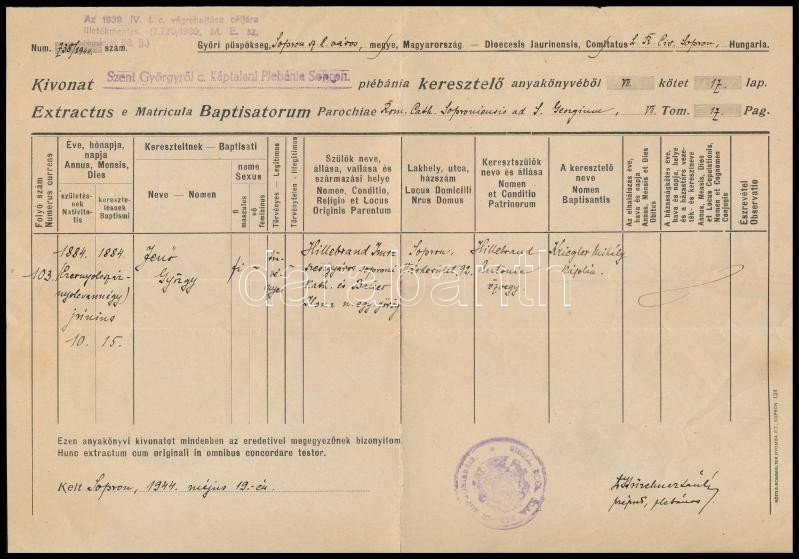 Beschreibung: 1944 Sopron, Hillebrand Jenő (1884-1950) ősrégész, antropológus keresztelési anyakönyvikivonata