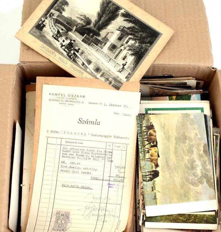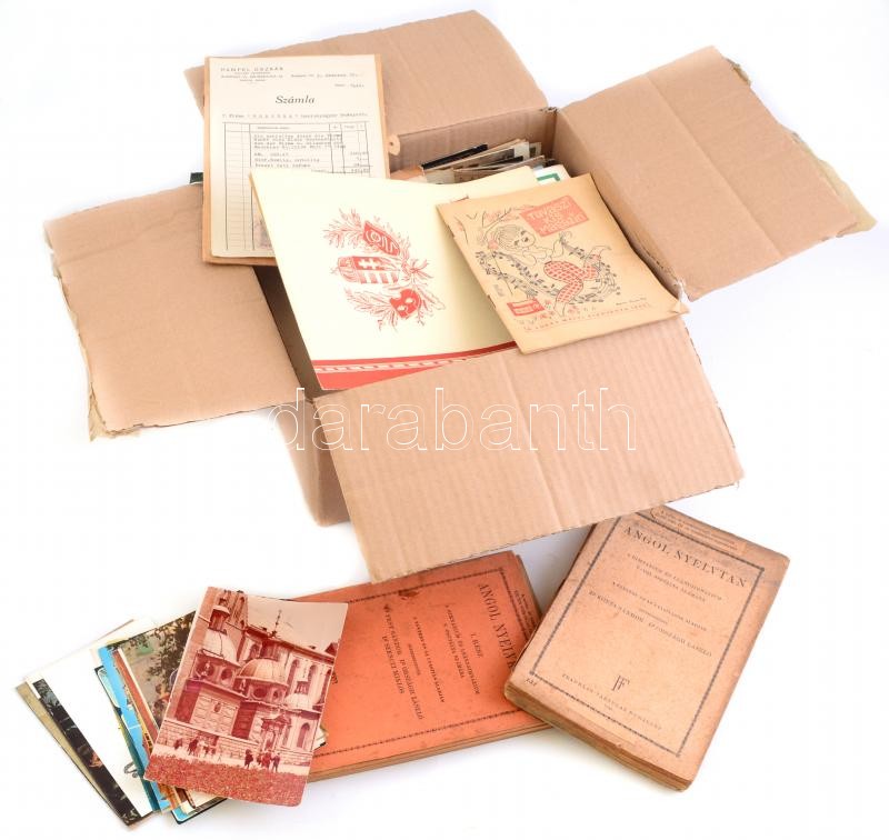 Doboznyi papírrégiség , benne régi tankönyvek, sok képeslap, távirat, újságok, receptkönyv, utazási prospektusok, cselédkönyv, Csurka István egy könyve