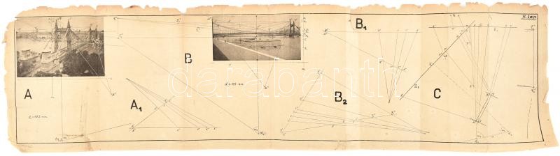 Beschreibung: Régi Erzsébet híd mechanikai erők leporellója, szakadozott szélekkel, 23x75 cm