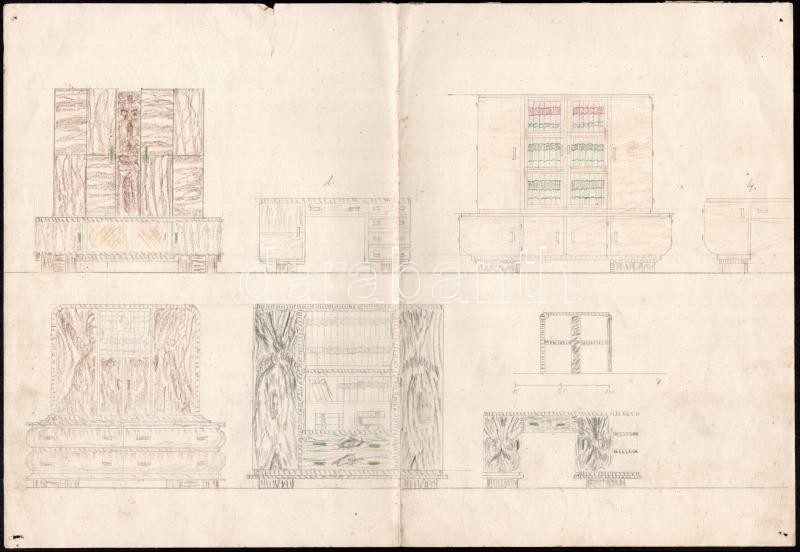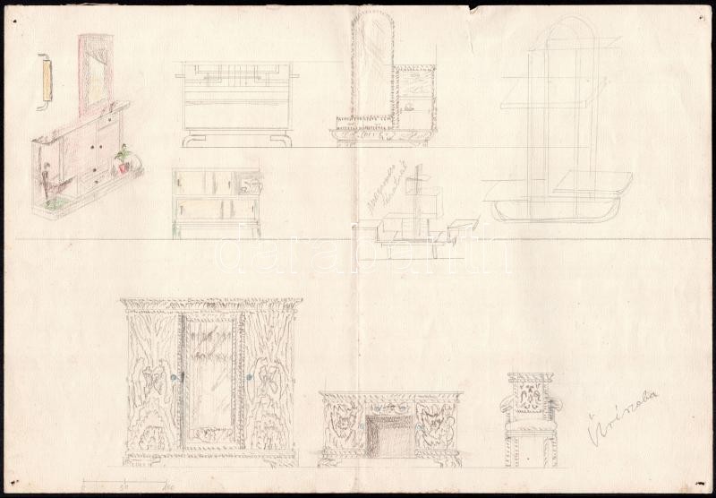 cca 1920-40 Úriszoba részben art-deco stílusú bútorainak terve. Ceruza, papír, kétoldalas. Lap tetején szakadással, hajtásnyommal. 29x41 cm