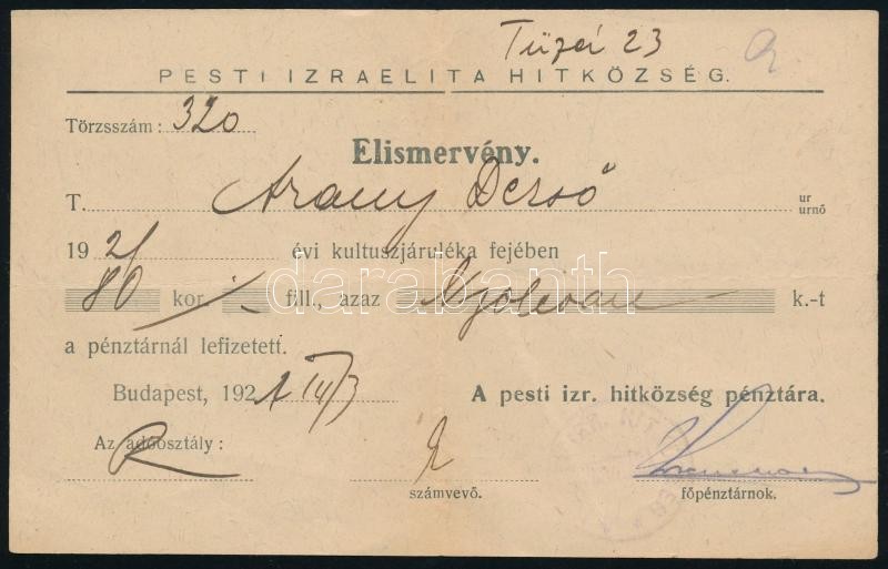 1922 Pesti Izraelita Hitközség pénztára 1921-es évi kultuszjárulék bef... https://www.darabanth.com/de/387-Fernauktion/387.0/Kunst-Dokumente-andere-Sammelgebiete/Judaica~27/1922-Pesti-Izraelita-Hitkozseg-penztara-1921-es-evi-kultuszjarulek-befizetesenek-nevre-szC3~II2306403