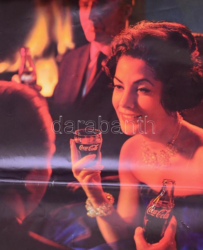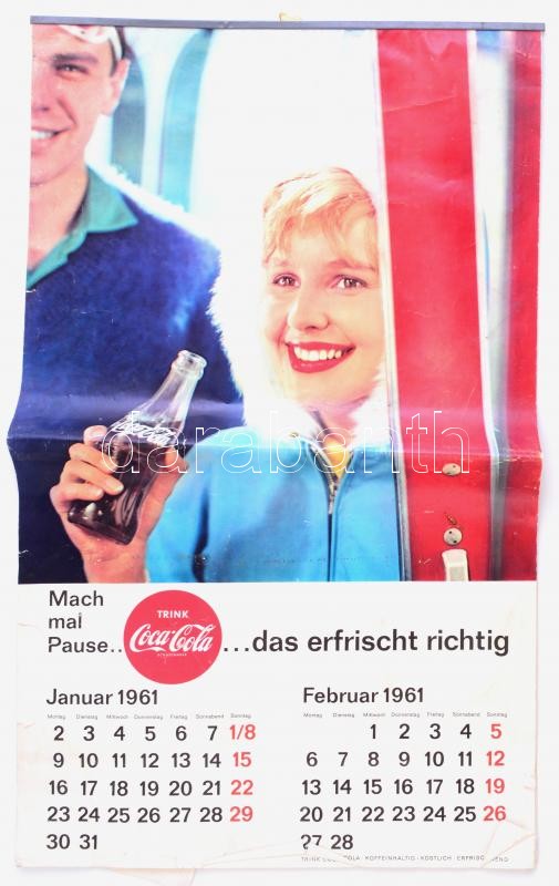 1961 Coca-Cola illusztrált reklám fali naptár, német nyelven, sérült, szakadásokkal, hajtásnyommal, 56x32 cm / 1961 Coca-Cola illustrated advertisement calendar in German languague, damaged condition, with tears, 56x32 cm
