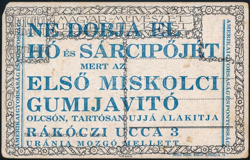 Első Miskolci Gumijavító reklámja Magyar Művészetes képeslapra nyomva https://www.darabanth.com/de/387-Fernauktion/387.0/Kunst-Dokumente-andere-Sammelgebiete/Werbungen~24/Elso-Miskolci-Gumijavito-reklamja-Magyar-Muveszetes-kepeslapra-nyomva~II2316162