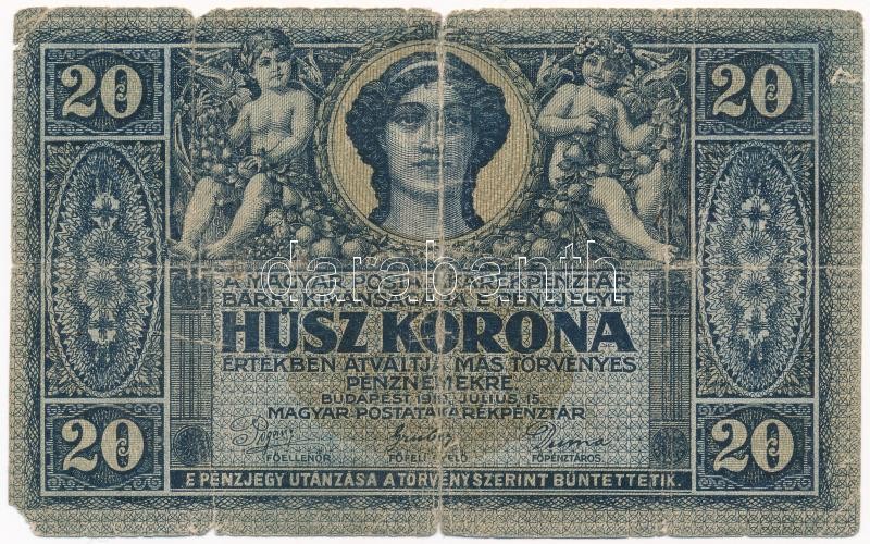 1919. július 15. 20K T:III-,IV Adamo K19 https://www.darabanth.com/de/387-Fernauktion/387.0/Numismatik/Ungarische-Banknoten~1500007/1919-julius-15-20K-TIII-IV-Adamo-K19~II2318643
