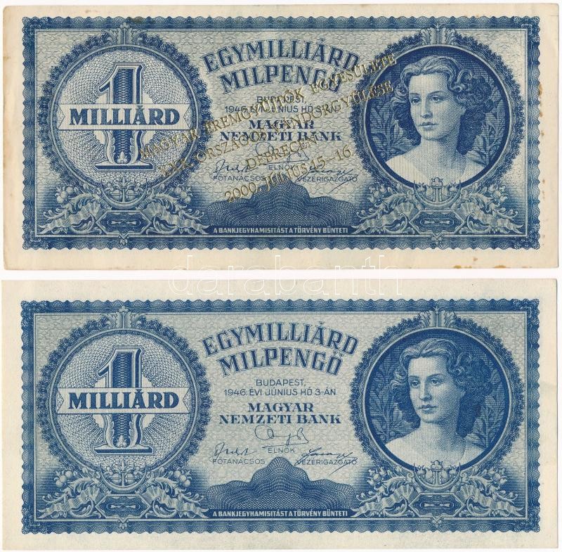 Beschreibung: 1946. 1.000.000.000MP (2x), egyik "Magyar Éremgyűjtők Egyesülete XXX. Országos Vándorgyűlése Debrecen 2000. július 15-16." felülbélyegzéssel T:I-,II hajtatlanok, fo. Adamo P34