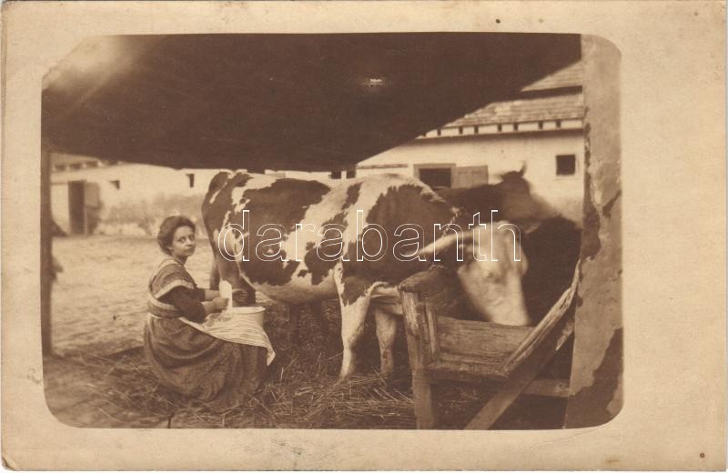 Tehénfejés / Girl milking a cow. photo https://www.darabanth.com/de/388-Fernauktion/388.0/Ansichtskarten/Folklore~2000064/Tehenfejes-Girl-milking-a-cow-photo~II2304681
