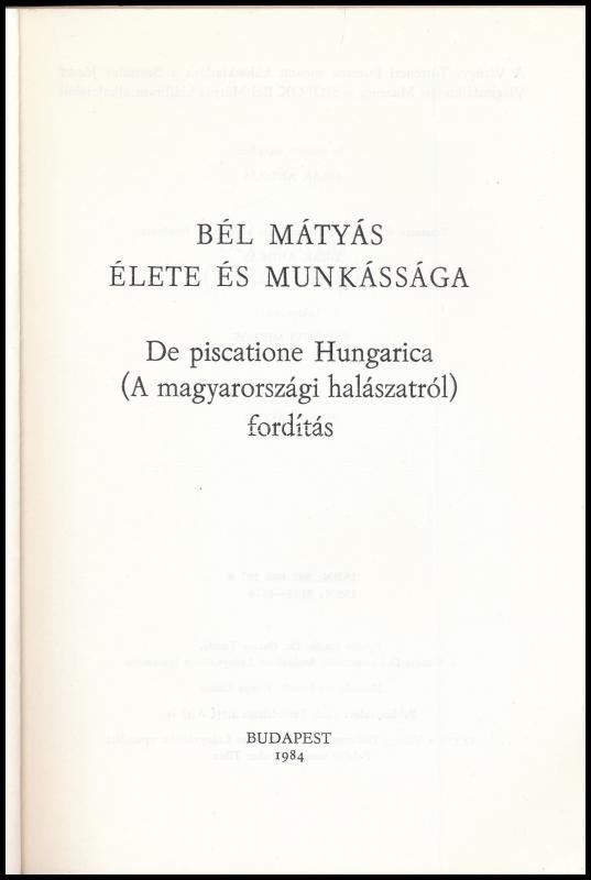 Bél Mátyás a magyarországi halakról és azok halászatáról. Deák András fordítása, a könyvben található életrajz Deák András munkája. Bp., 1984, a Vízügyi Dokumentációs Szolgáltató Leányvállalat kiadása. Papírkötésben, jó állapotban, térkép melléklettel.