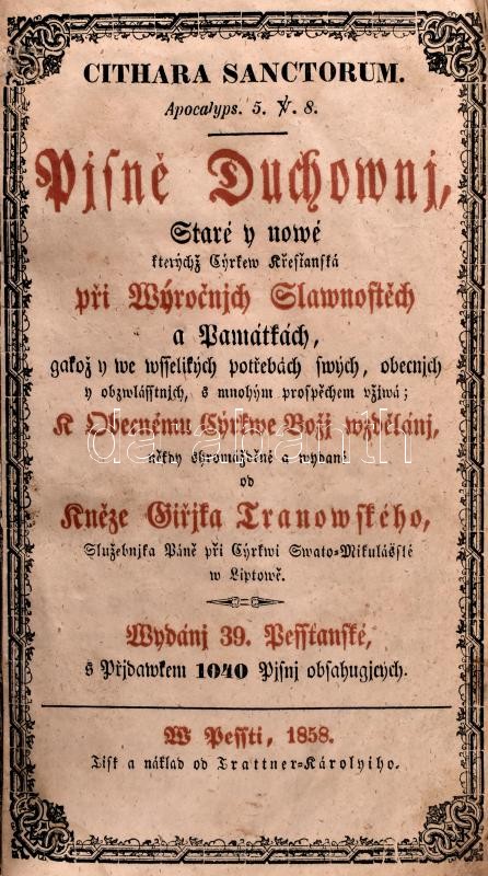 [Třanovský, Jiří (1597-1637):] Cithara sanctorum: Pjsně Duchownj, staré y nowé, kterychz cyrkew krest'anská pri wyrocnjch slawnostech a památkách ... Hozzákötve: 2 további imakönyv Pest, 1858, Trattner-Károlyi, Rézveretes egészbőr-kötésben, kopott, sérült borítóval, egy hiányzó rézkapoccsal, laza kötéssel, hiányos, megviselt