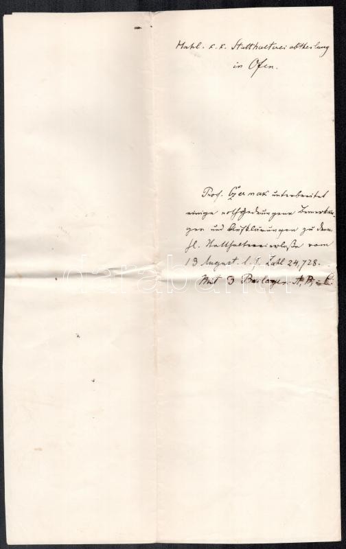 1858 Pest, Budára a helytartósághoz intézett dokumentum https://www.darabanth.com/de/388-Fernauktion/388.0/Kunst-Dokumente-andere-Sammelgebiete/Dokument~500018/1858-Pest-Budara-a-helytartosaghoz-intezett-dokumentum~II2333950